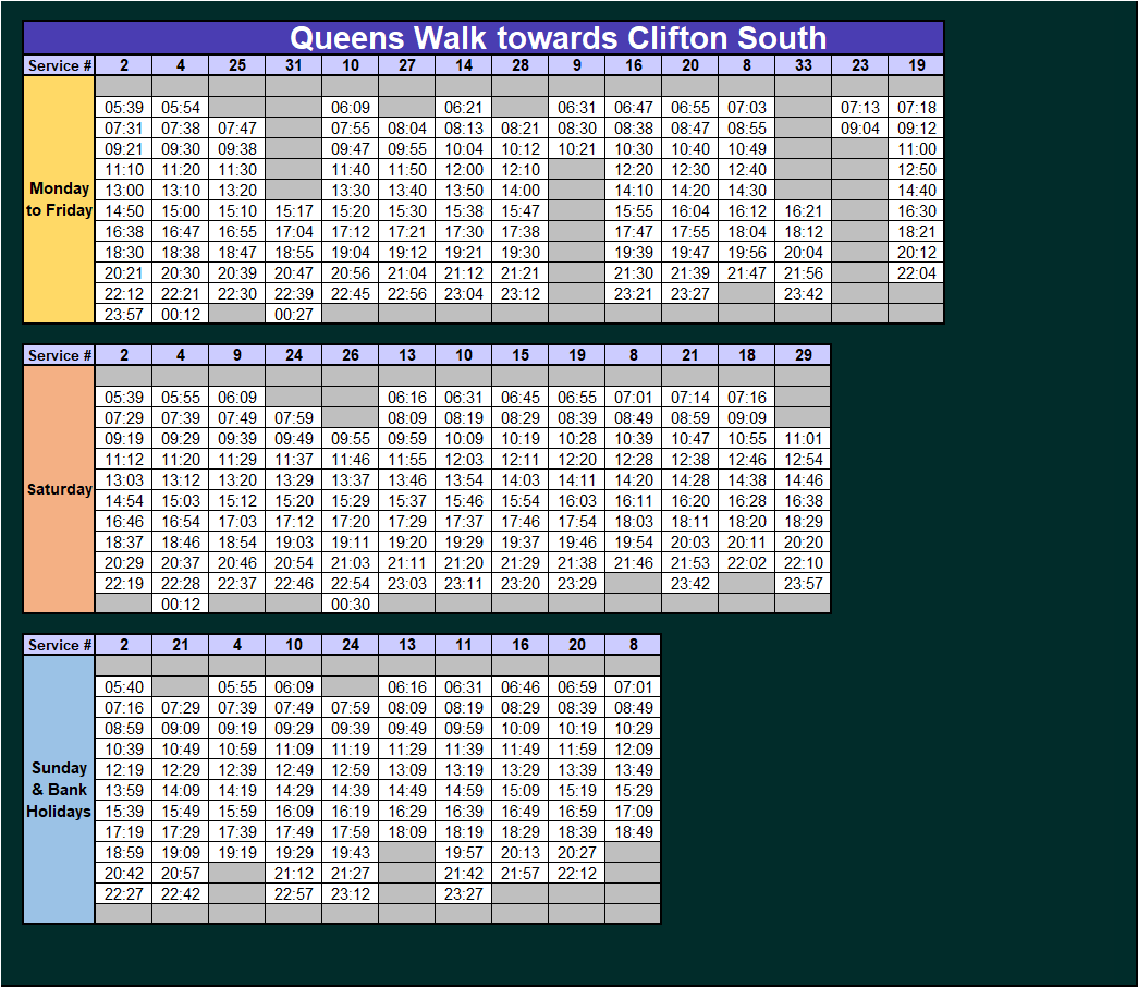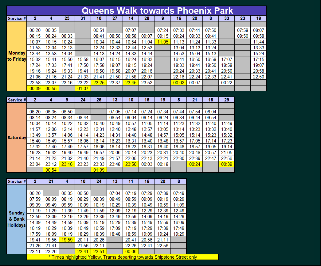 Here are the approximate journey times from Queens Walk to the following tram stops.